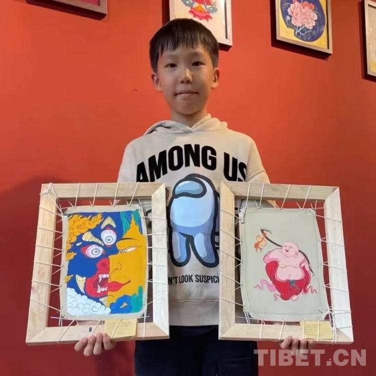 圖為體驗郎卡杰唐卡繪制的小朋友及其作品