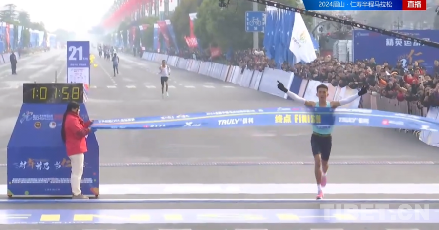 圖為2024仁壽半程馬拉來自西藏自治區(qū)運(yùn)動(dòng)員扎西次仁奪冠并打破全國(guó)半馬記錄