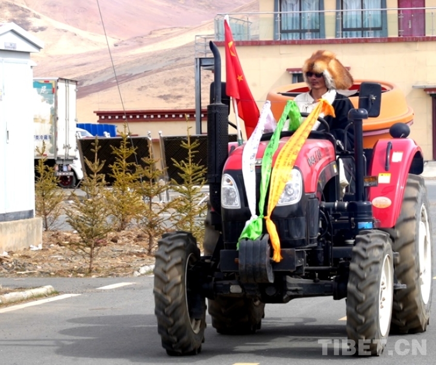 圖為犁手駕駛裝扮一新的拖拉機到農(nóng)田里