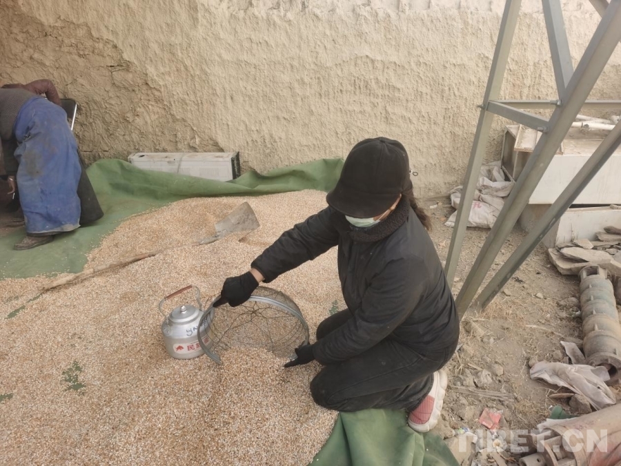 圖為駐村工作隊到電磨糌粑廠幫助群眾炒青稞