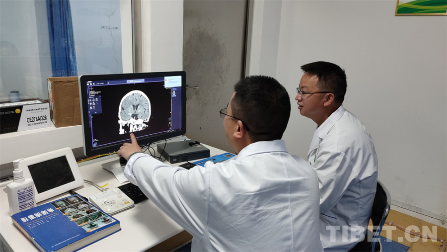 圖為醫(yī)療隊(duì)隊(duì)員對腦?;颊叩娘B腦CT進(jìn)行閱片