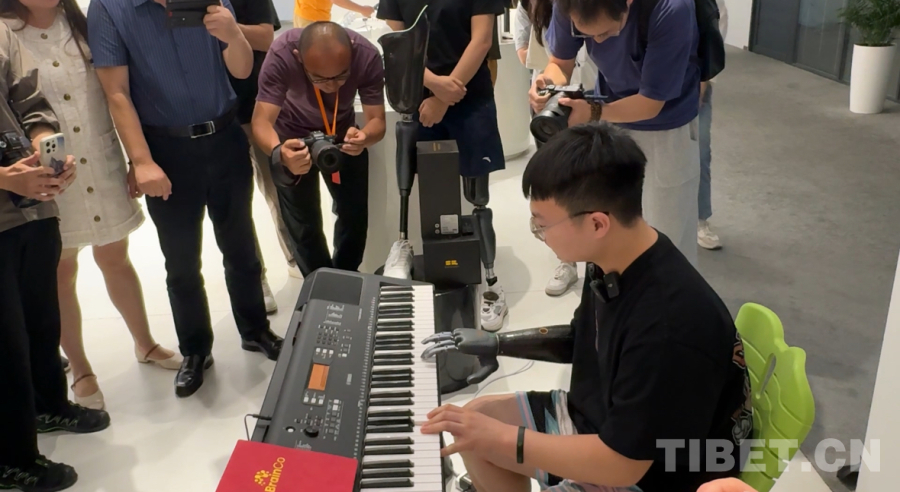 圖為BrainCo強腦科技產(chǎn)品體驗官周鍵在彈鋼琴