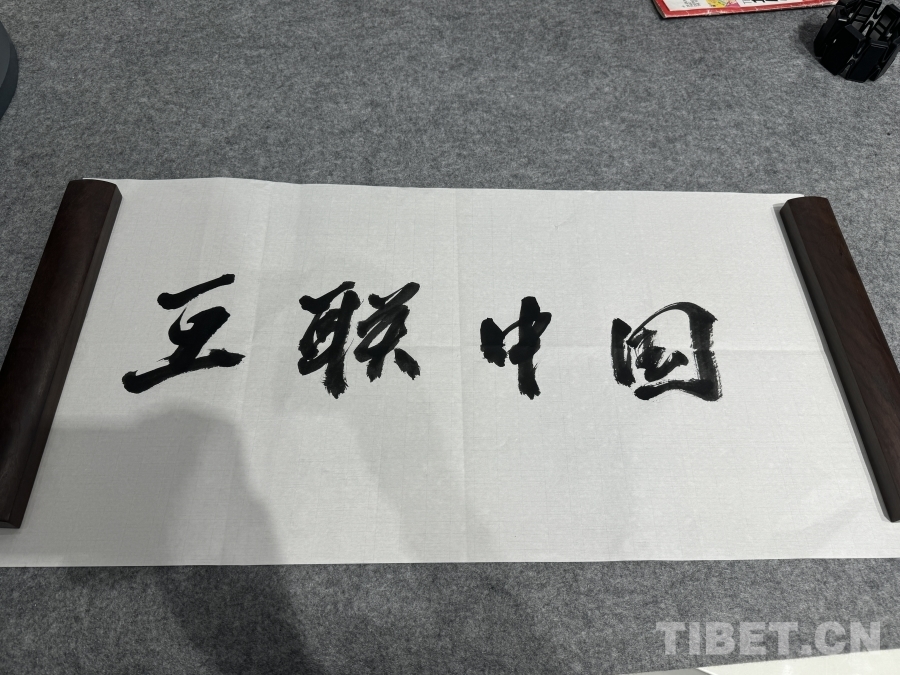 圖為BrainCo強腦科技產(chǎn)品體驗官倪敏成用毛筆字寫的“互聯(lián)中國”四字