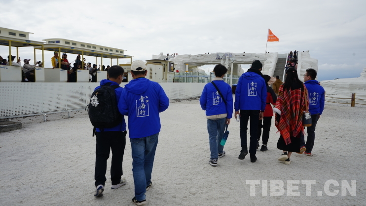 圖為導(dǎo)游小段向香港青少年學(xué)子介紹鹽湖景區(qū)。140余人的大隊(duì)伍卻只有少數(shù)人跟上,其他人早已迷失于茶卡鹽湖的美景之中。攝影:李泓慶