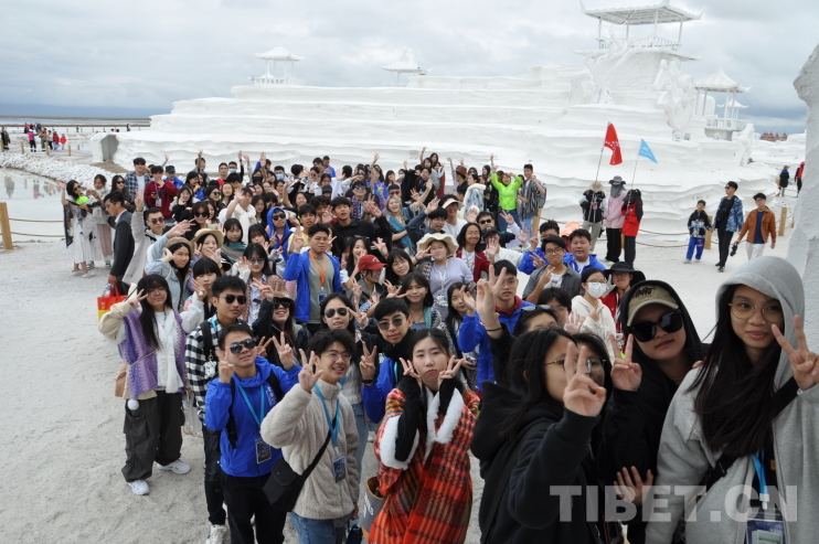 圖為香港青少年在茶卡鹽湖文化館外合影。攝影:趙振宇