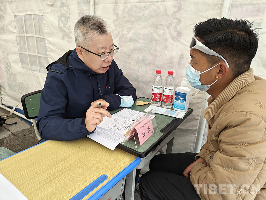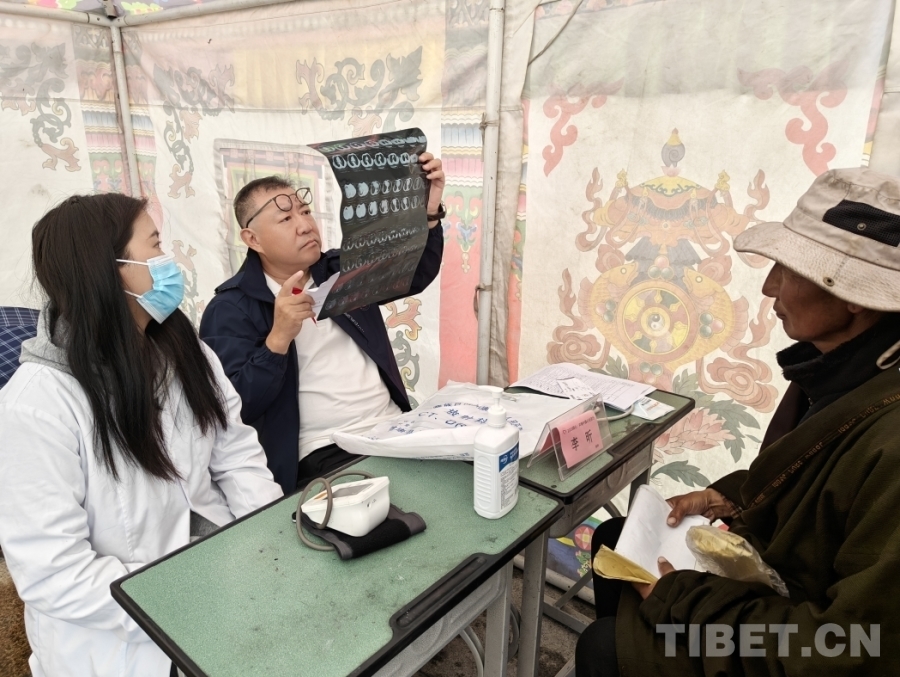 圖為中醫(yī)科副主任醫(yī)師白杰在塔公鎮(zhèn)為當(dāng)?shù)鼐用窳x診 供圖:北京同心共鑄公益基金會