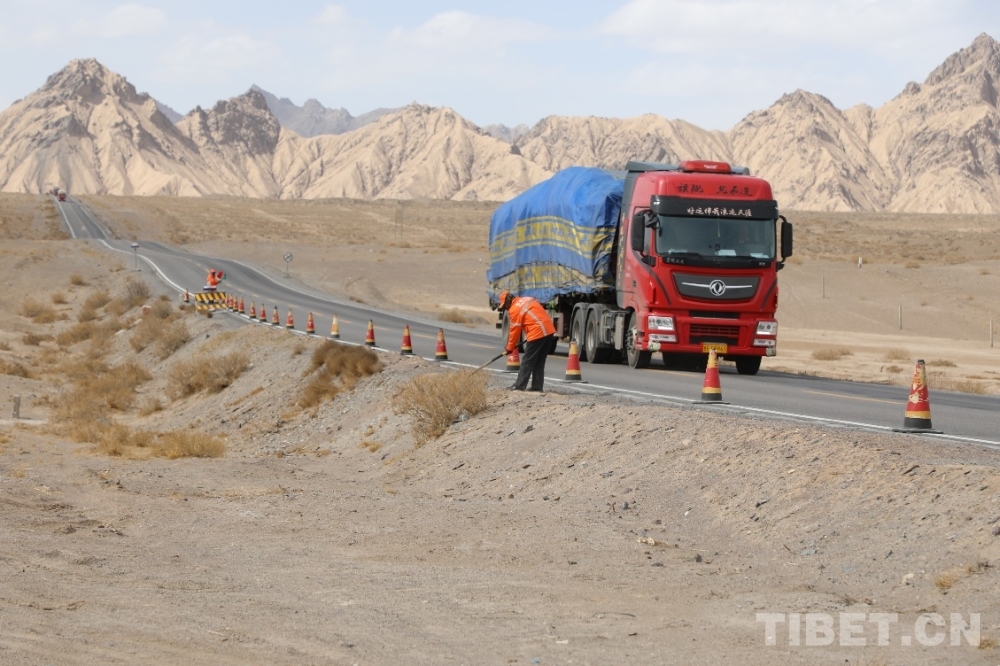 圖為青藏公路上行駛暢通無(wú)阻的汽車和勤勞的道班工人 攝影:王茜