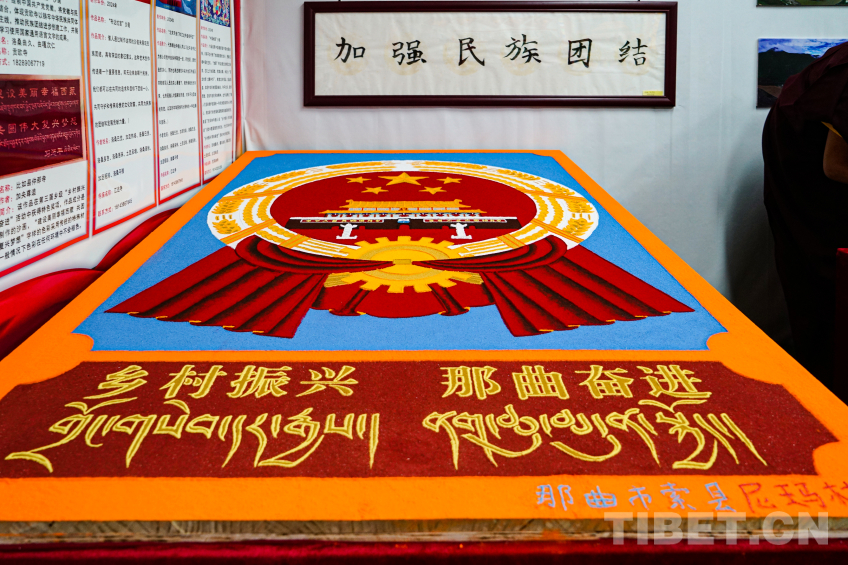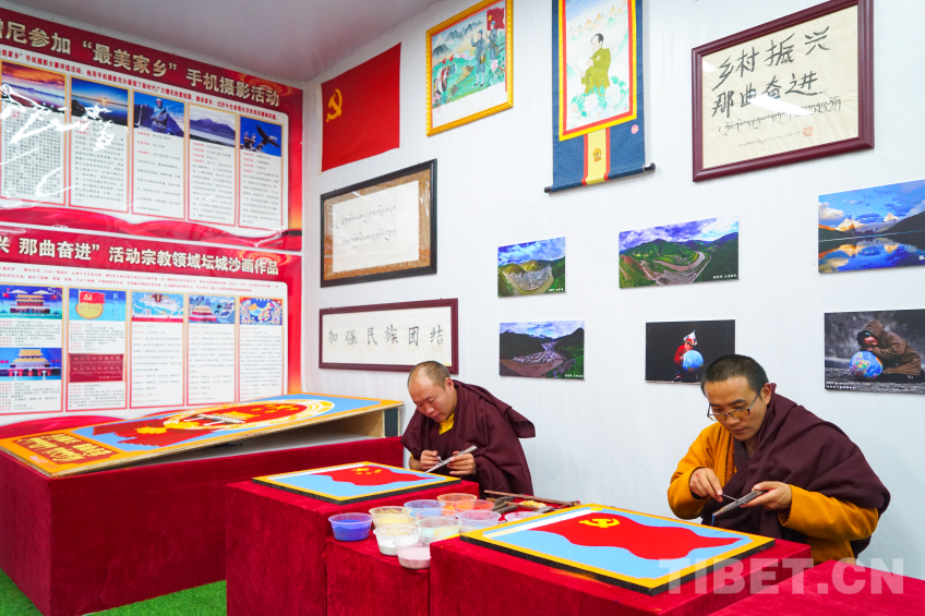 中國西藏網(wǎng)訊 2024年那曲恰青賽馬節(jié)暨第三屆“鄉(xiāng)村振興 那曲奮進(jìn)”活動現(xiàn)場,兩位來自那曲市索縣加勤鄉(xiāng)尼瑪林寺的僧人用彩砂繪制工藝?yán)L制黨徽、國旗、國徽等彩砂作品,深切表達(dá)藏傳佛教僧人愛黨愛國愛教之情,用實(shí)際行動踐行聽黨話、感黨恩、跟黨走,加深信教群眾對于祖國的熱愛。