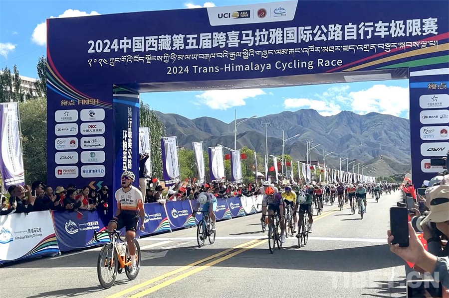 圖為日喀則賽段自行車選手沖線現(xiàn)場(chǎng) 攝影:邊子捷