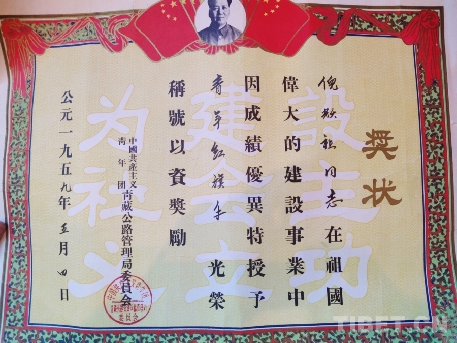 圖為1959年,中國共產主義青年團青藏公路管理局委員會授予倪躍祖青年紅旗手光榮稱號的獎狀