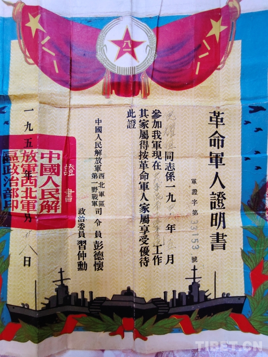 圖為中?國人民解放軍西北軍革命軍人證明書