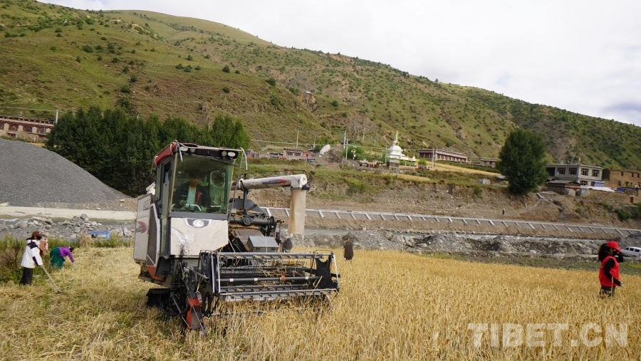 中國西藏網(wǎng)訊 眼下正是地處川西高原的四川省甘孜藏族自治州理塘縣青稞成熟時節(jié),群眾們忙著用收割機收獲青稞,在中秋時節(jié)感受豐收的喜悅。