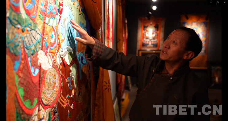 圖為國家級非遺項(xiàng)目拉薩堆繡唐卡傳承人羅布在介紹自己的唐卡作品 攝影:謝林翰