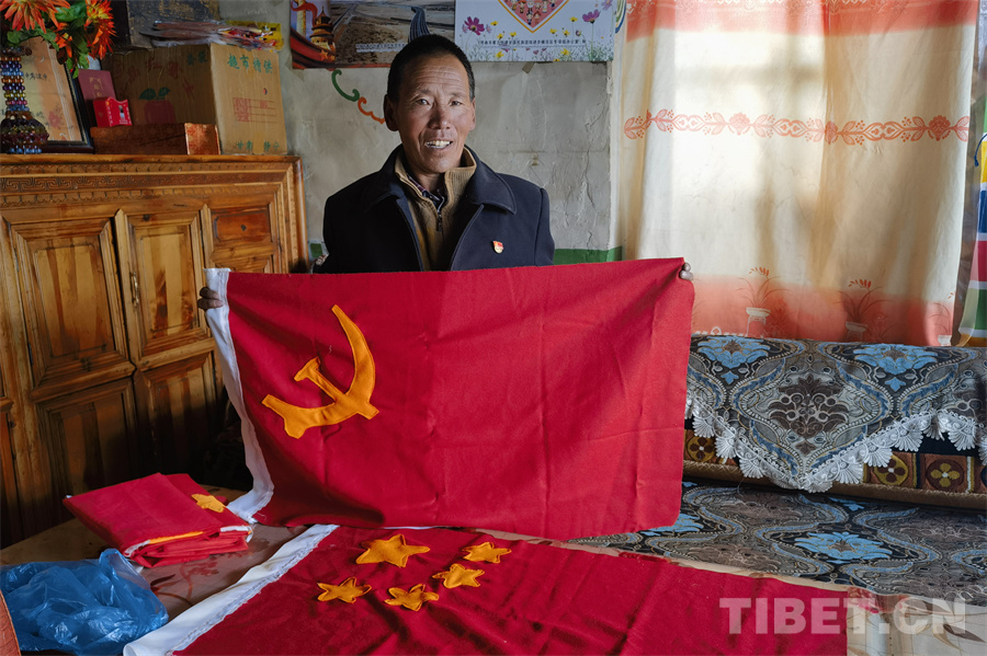 圖為多吉才覺(jué)展示親手縫制的國(guó)旗和黨旗 攝影:蔣馨悅