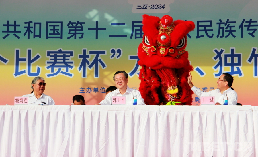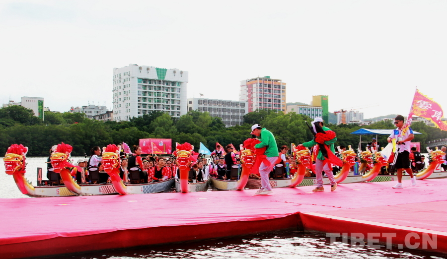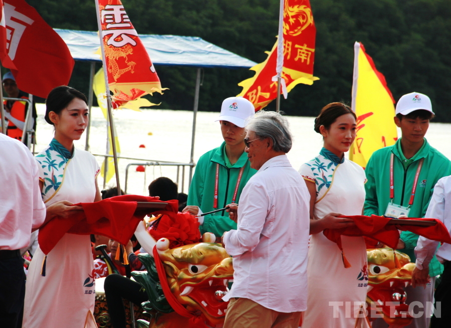 賽前,在龍舟巡游活動(dòng)后,國家民委副主任郭衛(wèi)平,海南省委常委、宣傳部部長王斌,香港代表團(tuán)顧問、中國香港體育協(xié)會(huì)暨奧林匹克委員會(huì)會(huì)長霍震霆,香港代表團(tuán)團(tuán)長,香港文化體育及旅游局體育專員蔡健斌,國家民委文化宣傳司司長張謀,國家民委港澳臺(tái)辦公室主任魏國雄,海南省政府副秘書長國章成,國家民委文化宣傳司副司長張劍輝,國家民委港澳臺(tái)辦公室副主任趙靜,海南省民委副主任黎梁東,海南省旅文廳副廳長王忠云,海南省三亞市政府副市長張長豐為龍舟點(diǎn)睛、披紅,將比賽氛圍烘托得格外喜慶熱烈。