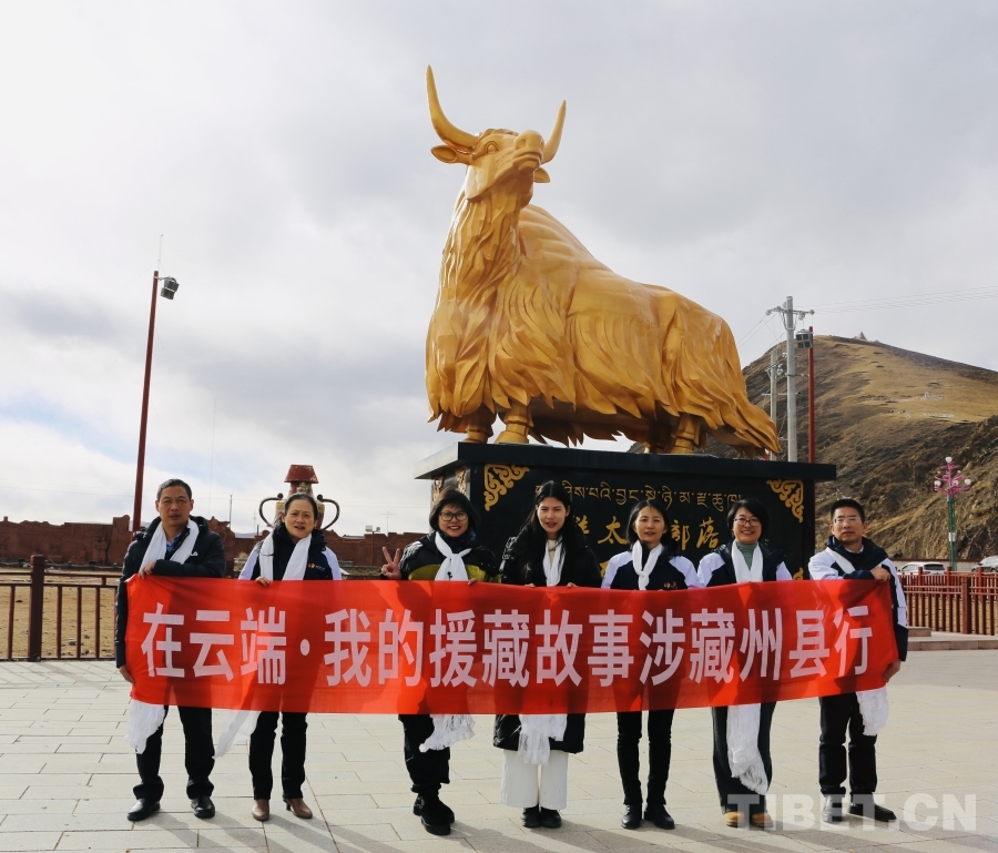 圖為宣講團(tuán)援藏干部代表在石渠縣金牦牛雕塑前合影留念 攝影:龍真多吉