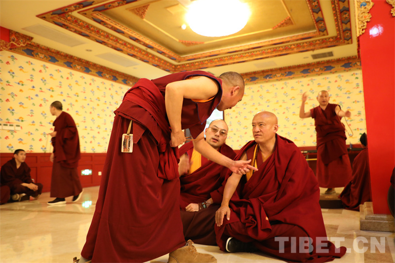 下午,師生們旁聽(tīng)了中國(guó)特色社會(huì)主義理論和憲法與法律基礎(chǔ)等課程。晚上,開(kāi)展了精彩非凡的辯經(jīng)活動(dòng)。學(xué)員們各自組團(tuán)尋找“對(duì)手”,大廳里激烈的辯論聲、擊掌聲此起彼伏,場(chǎng)面熱烈,氣勢(shì)逼人。辯經(jīng)是藏傳佛教中一種獨(dú)特的學(xué)習(xí)方式,通過(guò)對(duì)辯雙方邏輯清晰、言之有據(jù)的反復(fù)辯論,加深學(xué)習(xí)理解。
