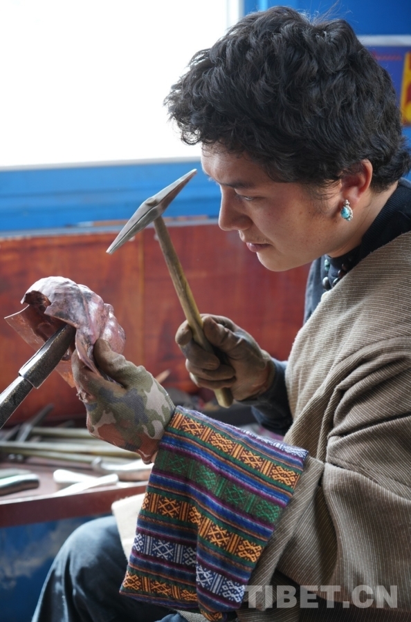 叮叮叮,叮叮?!し欢牵瑐鱽?lái)一陣陣金屬敲擊的聲響。掀開(kāi)門(mén)簾,一個(gè)小伙子坐在窗邊,右手拿錘,左手握著佛像架在細(xì)長(zhǎng)的鐵器上,右手的錘子不停地敲擊著,左手也在一邊輕微轉(zhuǎn)動(dòng),目光緊緊鎖在眼前的佛像上柔和而堅(jiān)定,古銅色的面龐與紅銅佛像仿佛在進(jìn)行無(wú)聲的“對(duì)話”。