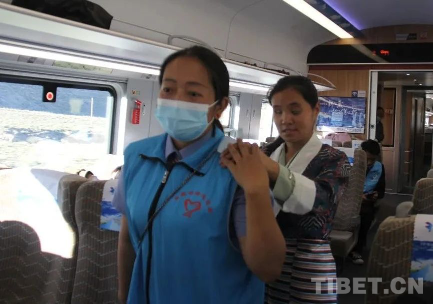 圖為“三站一途 天路導(dǎo)航”團(tuán)隊(duì)在高原復(fù)興號上幫助視障旅客