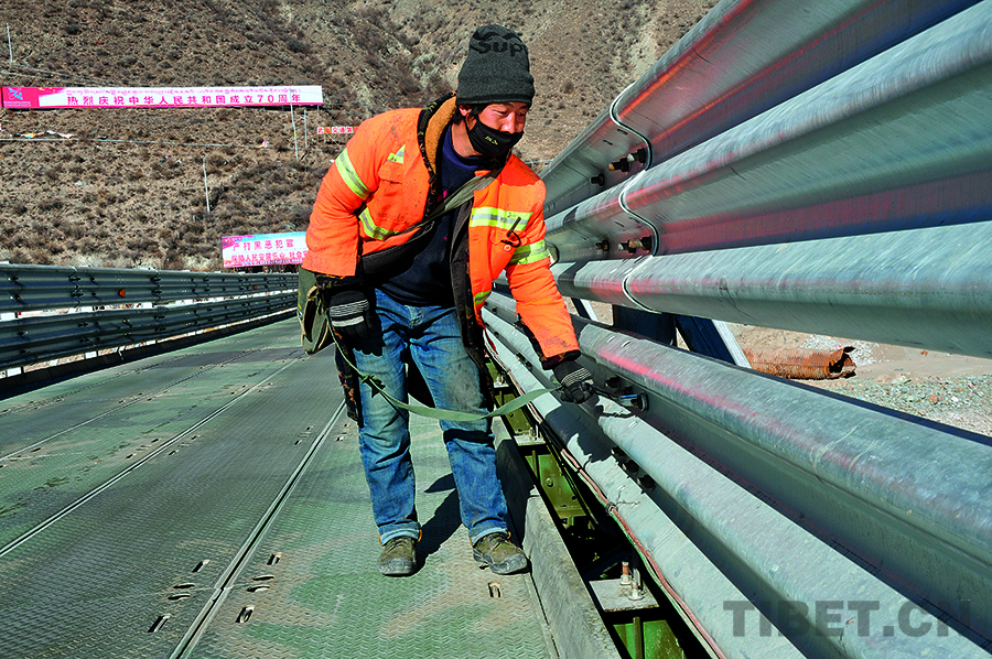 在西藏公路上行車,往往能見到忙碌的養(yǎng)護人。他們要么揮锨清除公路邊的雜物,要么驅(qū)車沿途巡查,要么在群山中清除路障,要么在緊鋼架橋護欄上的螺絲。在一條條公路上,川流不息的不僅有車輛,還有勇往直前的徒步者。有沒有人注意到,自己春夏秋冬能在西藏大地上自由穿梭,是因為高原上的大路平坦暢通。為他們保駕護航的,正是那些猶如盛開在山腳下、公路旁黃色小花的養(yǎng)護人。