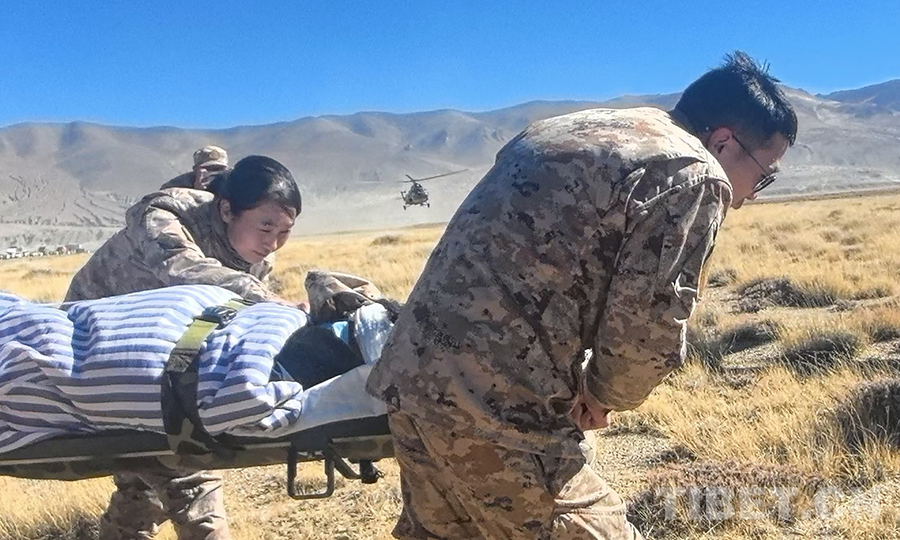 不久后,直升機緩緩降落到長所鄉(xiāng)衛(wèi)生院旁邊的草地上??紤]到現(xiàn)場風(fēng)沙特別大,軍醫(yī)對傷員的眼睛進行醫(yī)療處理,嚴(yán)密包扎。救護車停在比較平坦的位置,醫(yī)療隊員護送傷員小跑著。女軍醫(yī)邊瑞華摘下軍帽給普布格桑的眼睛蓋上,穩(wěn)穩(wěn)護住。一家人沒有去送他,“把丈夫交到解放軍手里,我們一萬個放心?!彼钠拮诱f。