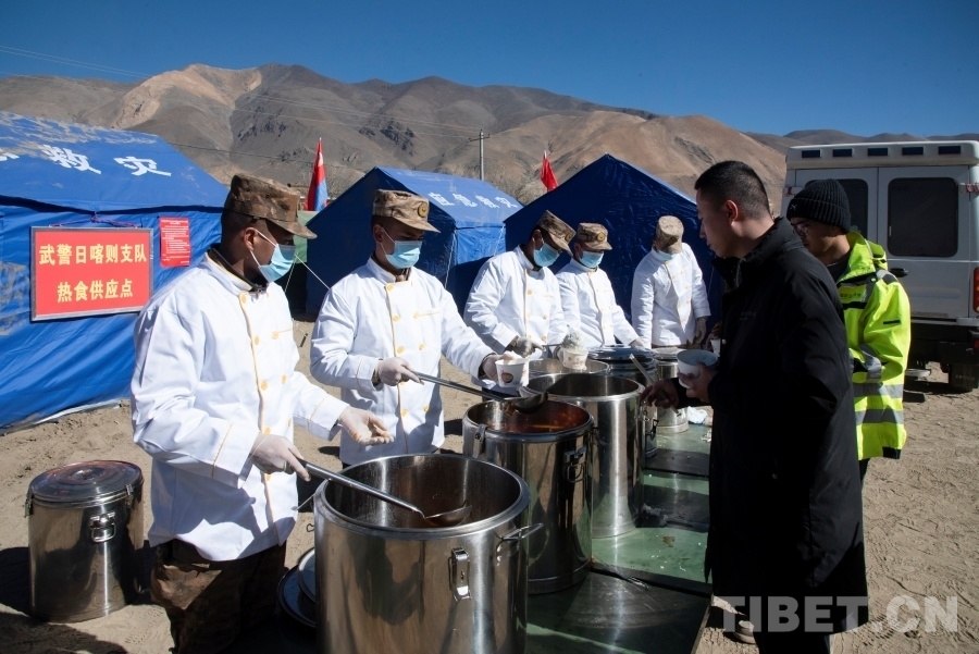 圖為武警日喀則支隊官兵正在向受災(zāi)群眾供應(yīng)熱食 攝影:趙振宇