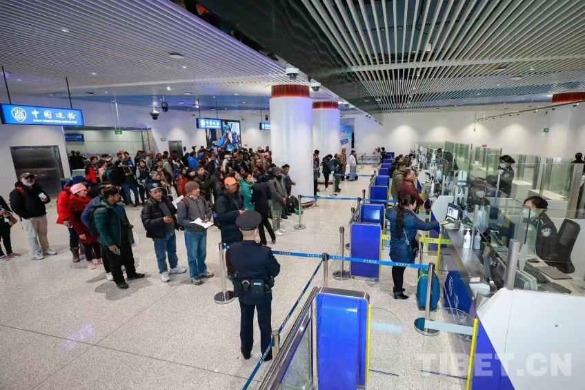 圖為拉薩至尼泊爾加德滿都國(guó)際航線正式復(fù)航通關(guān) 攝影:蔣美靈