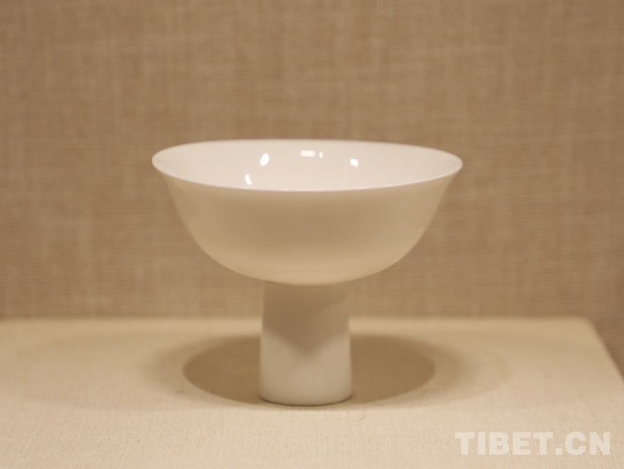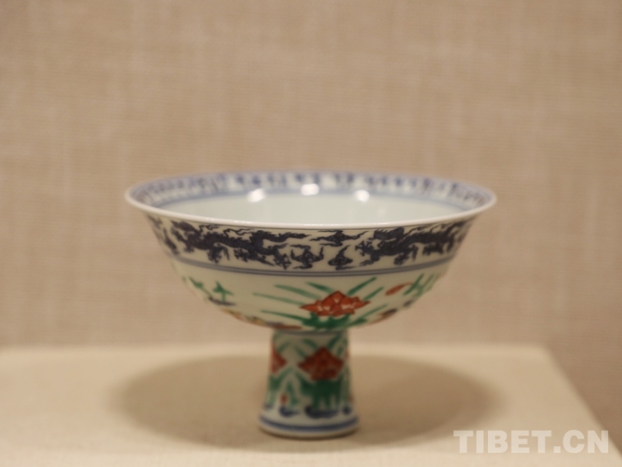 圖為明宣德青花五彩蓮池鴛鴦紋高足碗。經(jīng)鑒定,這只內(nèi)沿書寫著藏文的高足碗是明代中央政府向薩迦寺賜送的實(shí)物見證 攝影:王茜