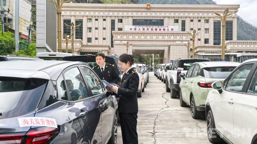 圖為海關(guān)工作人員在吉隆口岸對(duì)出口新能源汽車進(jìn)行查驗(yàn) 圖片由拉薩海關(guān)提供