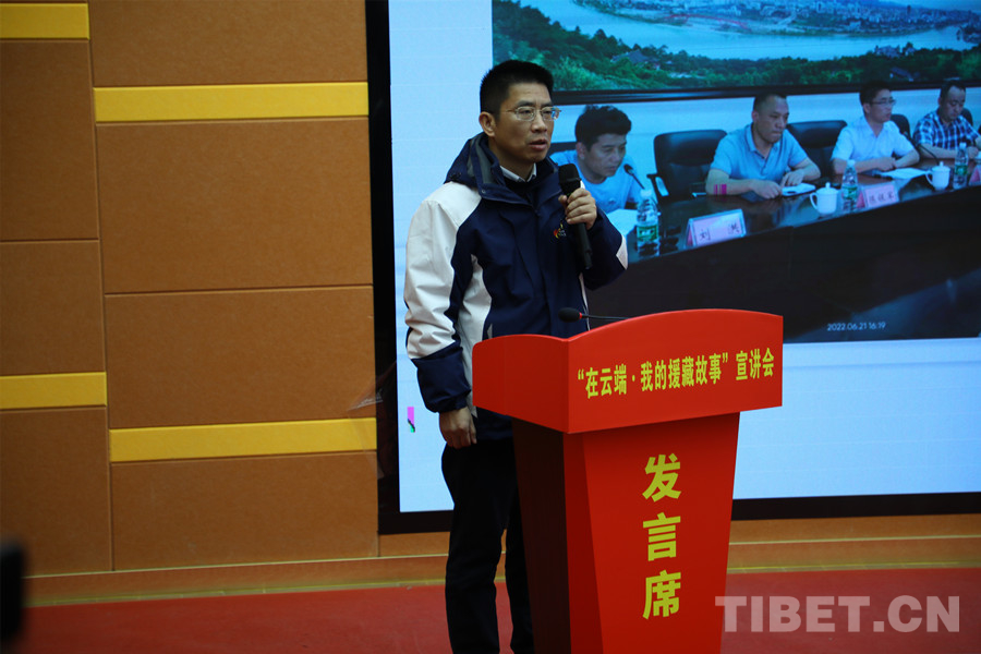 圖為邱鎮(zhèn)江在稻城縣宣講援藏故事 攝影:龍真多吉
