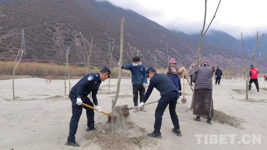 圖為西藏林芝邊境管理支隊派邊境派出所民警與當地群眾一起植樹