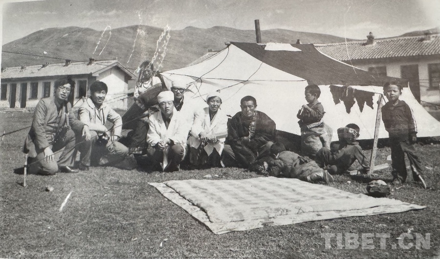 圖為20世紀(jì)80年代,王萬青(左五)和群眾在阿萬倉衛(wèi)生院內(nèi)帳篷前的合影 翻拍:易文文