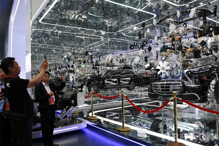 圖為西藏自治區(qū)工商聯(lián)民營(yíng)企業(yè)家赴京學(xué)習(xí)參觀團(tuán)一行在北方國(guó)際汽車教育拍攝奔馳整車吊裝爆炸式工業(yè)藝術(shù)展示 攝影:劉莉