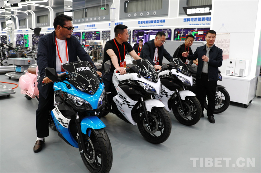 圖為西藏自治區(qū)工商聯(lián)民營(yíng)企業(yè)家赴京學(xué)習(xí)參觀團(tuán)一行體驗(yàn)氫能摩托車 攝影:劉莉