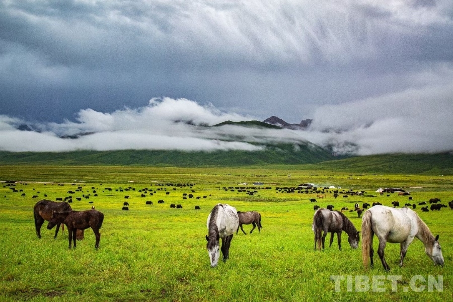在這里,千百年來牧民們轉(zhuǎn)場放牧的古老智慧,讓草場得以休養(yǎng)生息;煨桑的裊裊青煙,將感恩與敬畏注入每一寸土地。在這里,阿萬倉牦牛以蹄印丈量時間,歐拉羊群如云影般掠過草原,河曲藏獒守護(hù)著草原的漫漫長夜,河曲馬踏響格薩爾王的千年傳說,它們都是舞動在高原上的精靈。