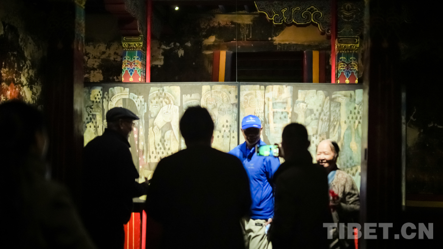 此次展覽中,策展人以“藏地傳統(tǒng)的當(dāng)代轉(zhuǎn)化”為主線,梳理上述不同系列作品,完整呈現(xiàn)出藝術(shù)家的創(chuàng)作脈絡(luò)。展覽標(biāo)題“夢瑜伽”,來自《黑經(jīng)書》系列作品的創(chuàng)作故事,清代壁畫環(huán)繞的獨特古建場域與《黑經(jīng)書》系列作品于光影間輝映,共同營造出西藏藝術(shù)歷史與當(dāng)下交錯的鏡像,在搭建橋梁、連結(jié)傳統(tǒng)與時代精神的同時,也引領(lǐng)觀眾走入高強度的精神性探索。
