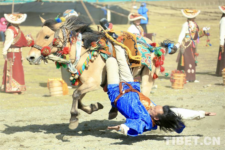 圖為賽馬選手在馬背上展示特技動(dòng)作 攝影:龍真多吉