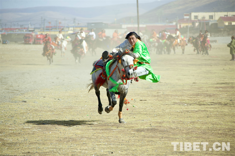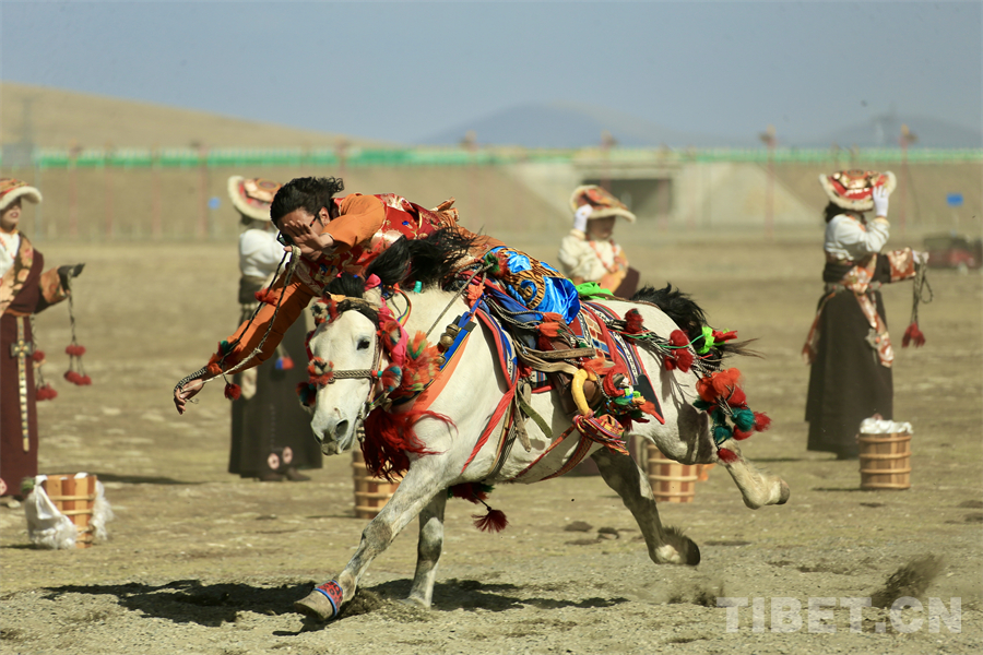 在海拔4000米左右的遼闊天地間,康巴漢子們駕馭著矯健的駿馬、身著華美的傳統(tǒng)服飾,如疾風(fēng)般掠過(guò)金色的草原,在馬背上展示跑馬射箭、乘馬射擊、跑馬拾哈達(dá)、跑馬倒立、跑馬懸體等高難度動(dòng)作,馬蹄聲聲、歡呼陣陣,交織成高原最豪邁的樂章。(中國(guó)西藏網(wǎng) 記者/畢然 龍真多吉)