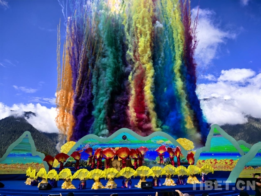 圖為5月28日,米林市第十七屆黃牡丹藏醫(yī)藥文化旅游節(jié)開幕演出在藍天白云下舉行。攝影:王淑