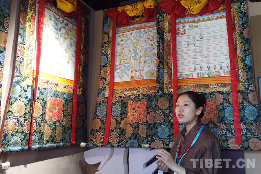 圖為那曲市輪展現(xiàn)場(chǎng),來(lái)自嘉黎縣藏醫(yī)院的次旦拉姆介紹藏醫(yī)藥唐卡 攝影:楊月云