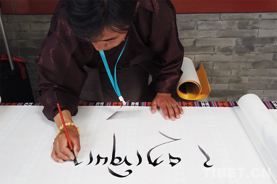 圖為那曲市書(shū)法家協(xié)會(huì)的斯秋平措現(xiàn)場(chǎng)展示藏文書(shū)法 攝影:楊月云
