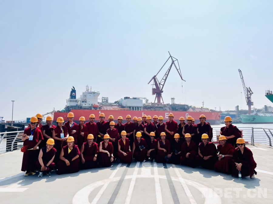圖為西藏佛學(xué)院師生在上海江南造船廠合影,近距離接觸中國(guó)制造的先進(jìn)液化乙烯(LEG)運(yùn)輸船 攝影:趙振宇