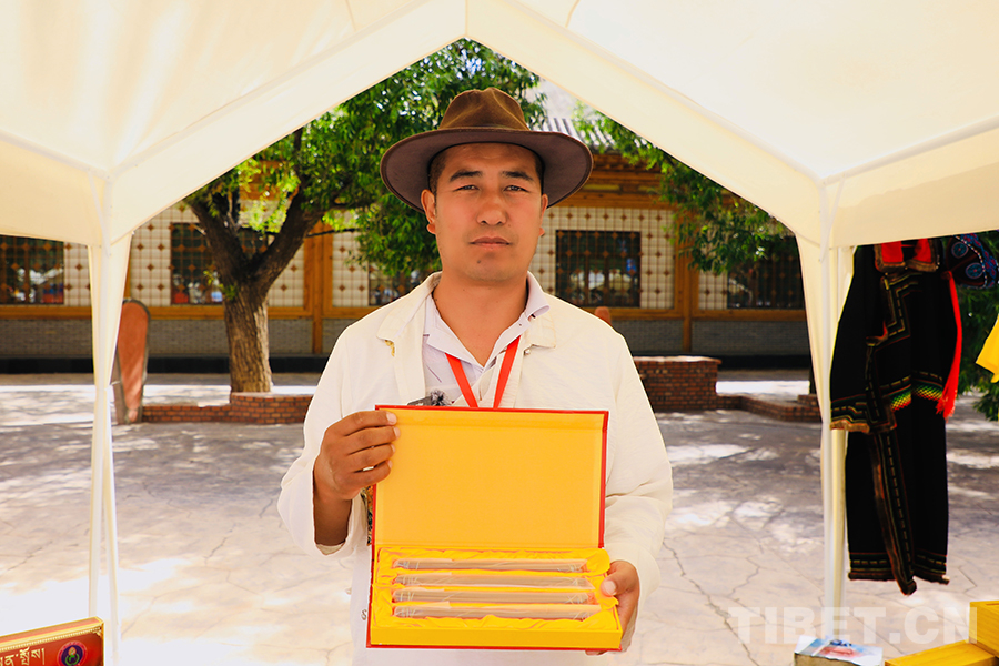 “我今天主要帶來的是我們的工藝產(chǎn)品‘供養(yǎng)藏香’,這些包裝樣式不一的藏香根據(jù)規(guī)格大小都有各自的價位,但每一根藏香上付出的心血及所使用的工藝和配料都一致,其中我們也更注重藏香的配料,都是精心篩選的白檀香、藏紅花、安息香、白黑沉香、甘松等二十多種源自高原的天然藥物和香味植物。”當(dāng)問到目前的銷售情況時,他坦言道:“今天賣出去的并不是很多,不過今天能和眾多的優(yōu)秀手工藝人同臺參展機會難得,對我來說也是一種學(xué)習(xí)和展現(xiàn)的契機。”