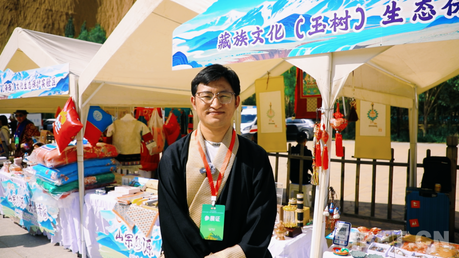 圖為非遺傳承人土登旦周接受記者采訪 攝影:龍真多吉