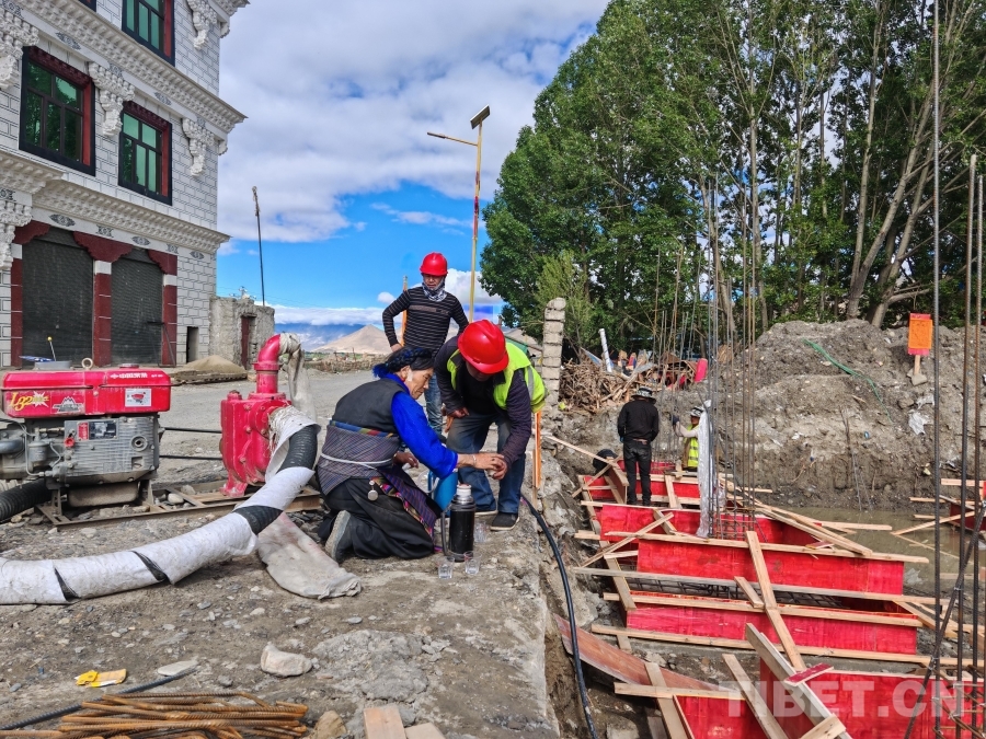 在仲康村巴桑家的重建工地上,工程已進(jìn)入鋼筋捆扎階段。一場突如其來的夜雨導(dǎo)致基坑積水。清晨七八點,施工隊員已在基坑中忙碌開來,有的加緊捆扎鋼筋,有的尋找水泵抽水。日頭漸高,汗水浸濕了工人們的額頭,他們卻無暇休息。這時,阿媽巴桑提著一壺剛煮好的甜茶走來,就地一杯杯沏好,熱情地招呼這群“小伙子”?!耙郧暗睦戏孔诱饓牧?,現(xiàn)在黨和政府給我們建更好的新房子,日子肯定越過越有盼頭!”樸實的話語里,滿是她對未來的憧憬和對援助的感激。