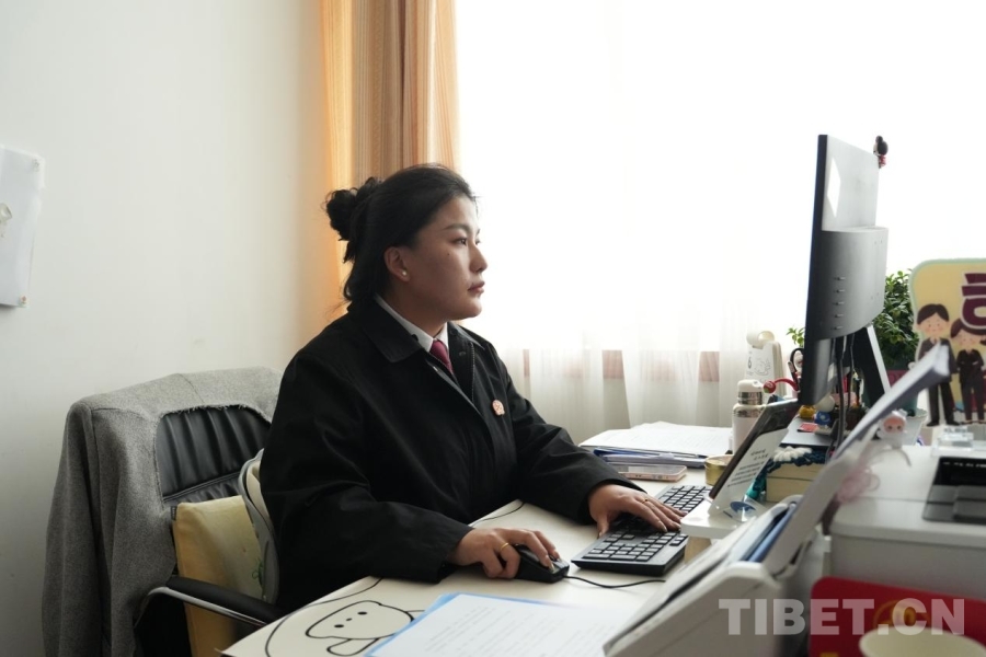 圖為正在辦公的阿里地區(qū)中級人民法院書記員尼瑪卓瑪 攝影:邊子捷