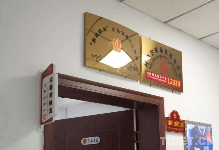 圖為阿里地區(qū)中級人民法院的溫馨調(diào)解室及“象雄梅朵”女法官維權工作站牌匾 攝影:邊子捷
