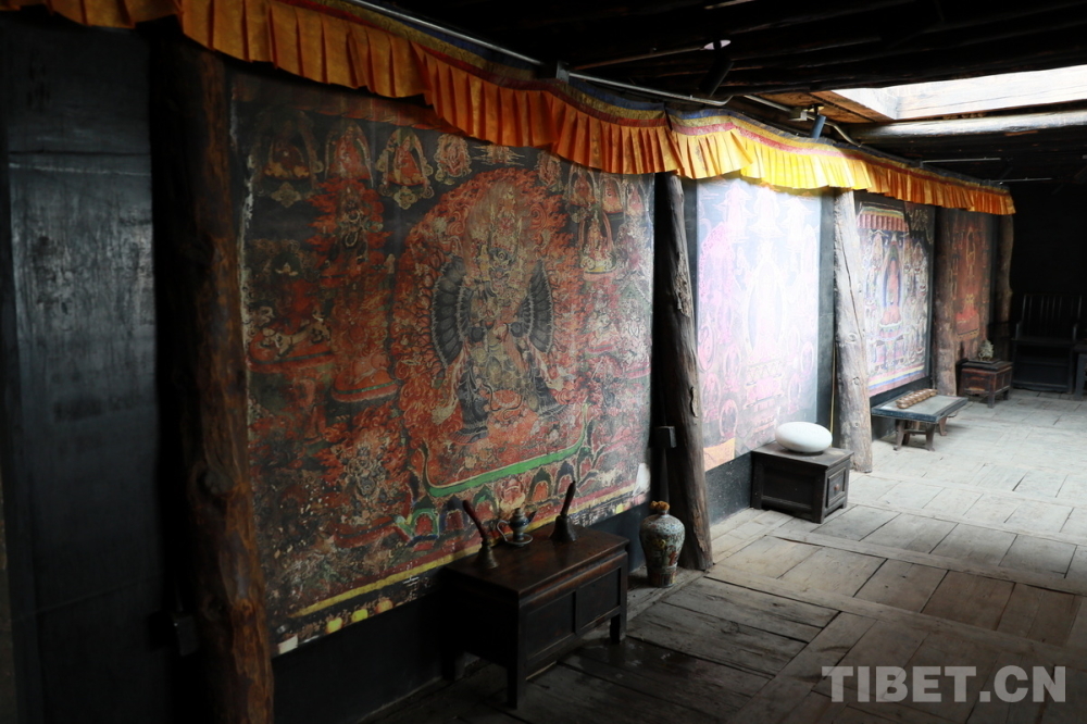 宗薩木府最驚艷的是其經(jīng)堂中歷經(jīng)380余年歷史仍色彩絢麗、保存完整的整堂壁畫。新中國成立后,宗薩木府曾被收歸公有,許多無房的當(dāng)?shù)刎毨罕姳话才抛∵M(jìn)了這里?!拔母铩睍r期,宗薩木府的經(jīng)堂被作為村里的倉庫,人們用報紙糊住壁畫,使這些藝術(shù)珍品沒有受到“破四舊”的影響。
