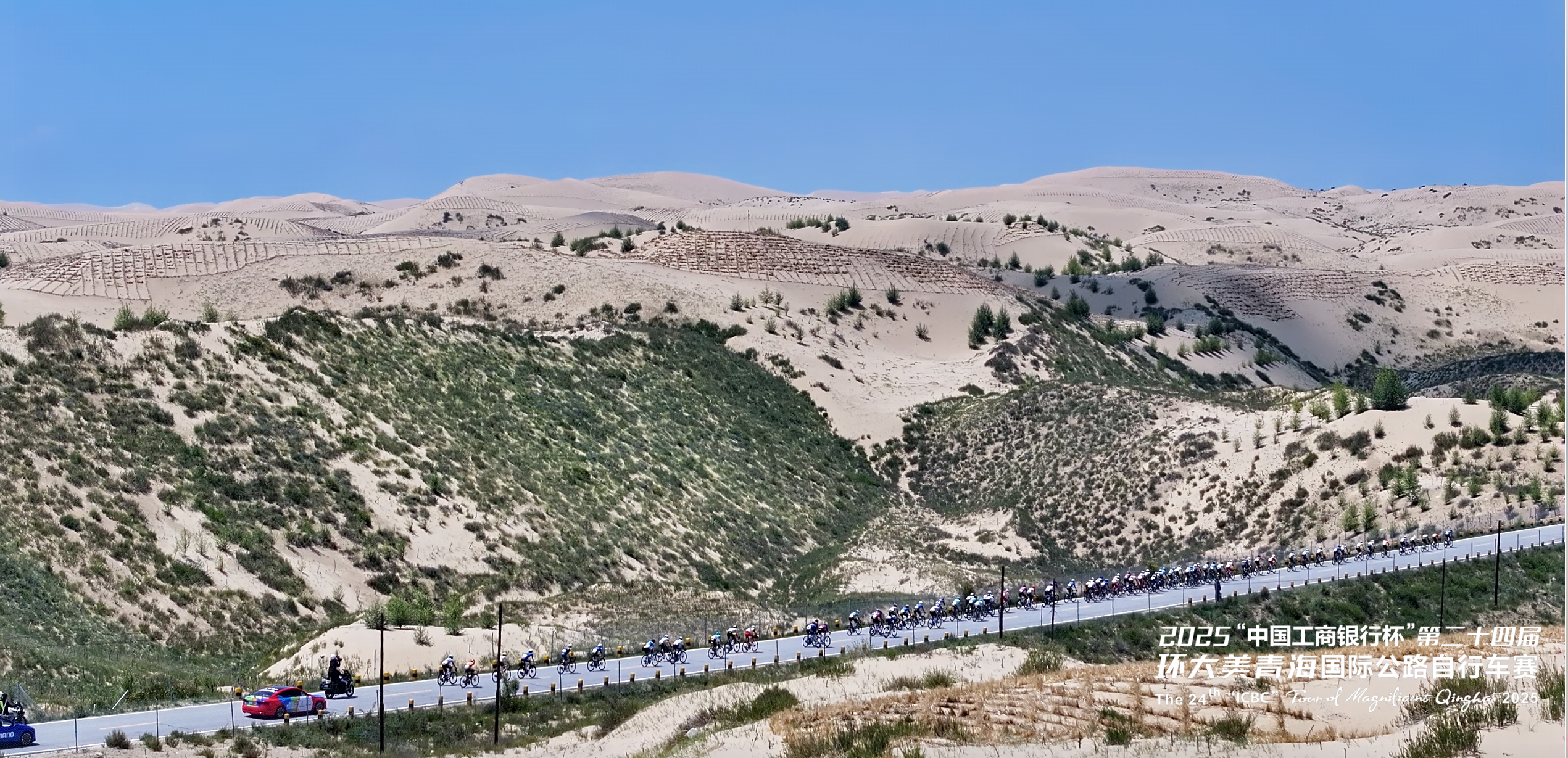 第二十四屆環(huán)青賽第七賽段——共和-海晏賽段。賽段經(jīng)過(guò)海拔約3740米的洛合埡口,居高臨下,以近乎180度的角度俯瞰青海湖,將湖面、山巒、草原盡收眼底。