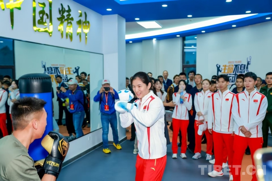 圖為奧運(yùn)冠軍一行來到西藏軍區(qū)某部